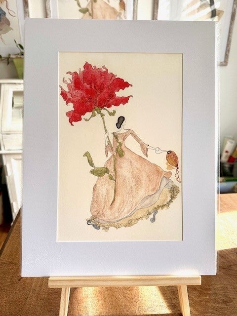 Ein Hauch von zeitloser Eleganz: Die Darstellung einer stilvollen Dame, verziert mit einer leuchtend roten Blume, symbolisiert Schönheit in ihrer reinsten Form.