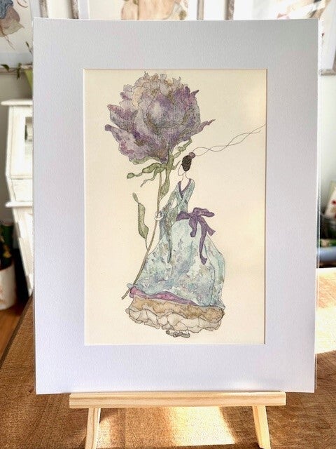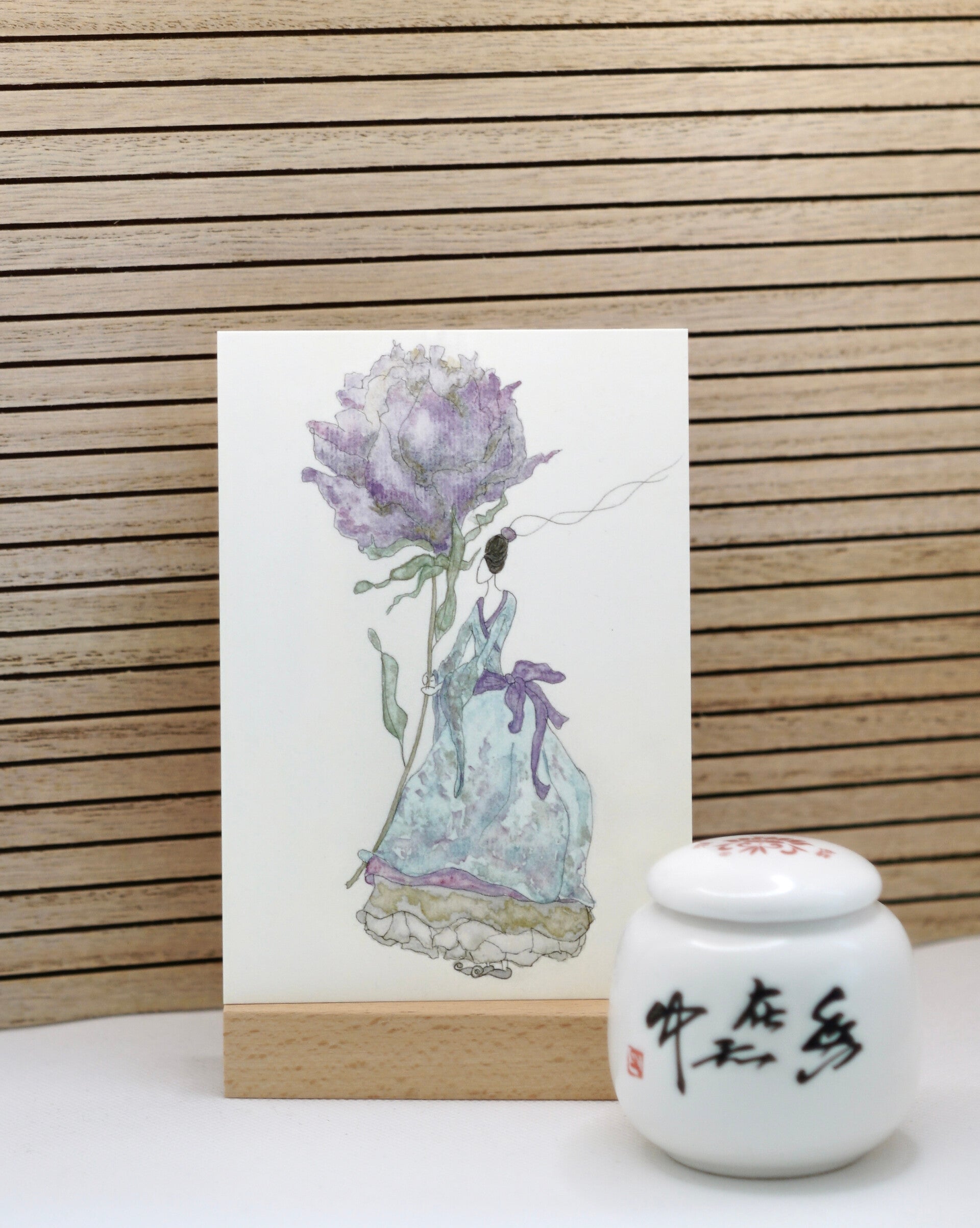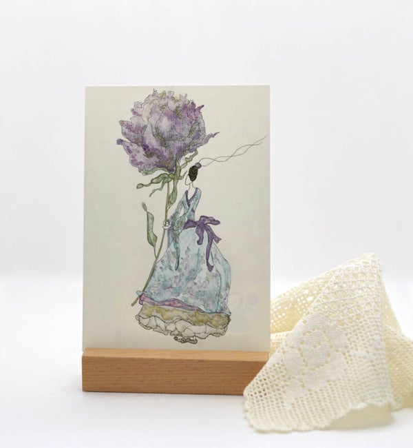 Elegante Darstellung einer Dame mit einer purpurnen Blume.