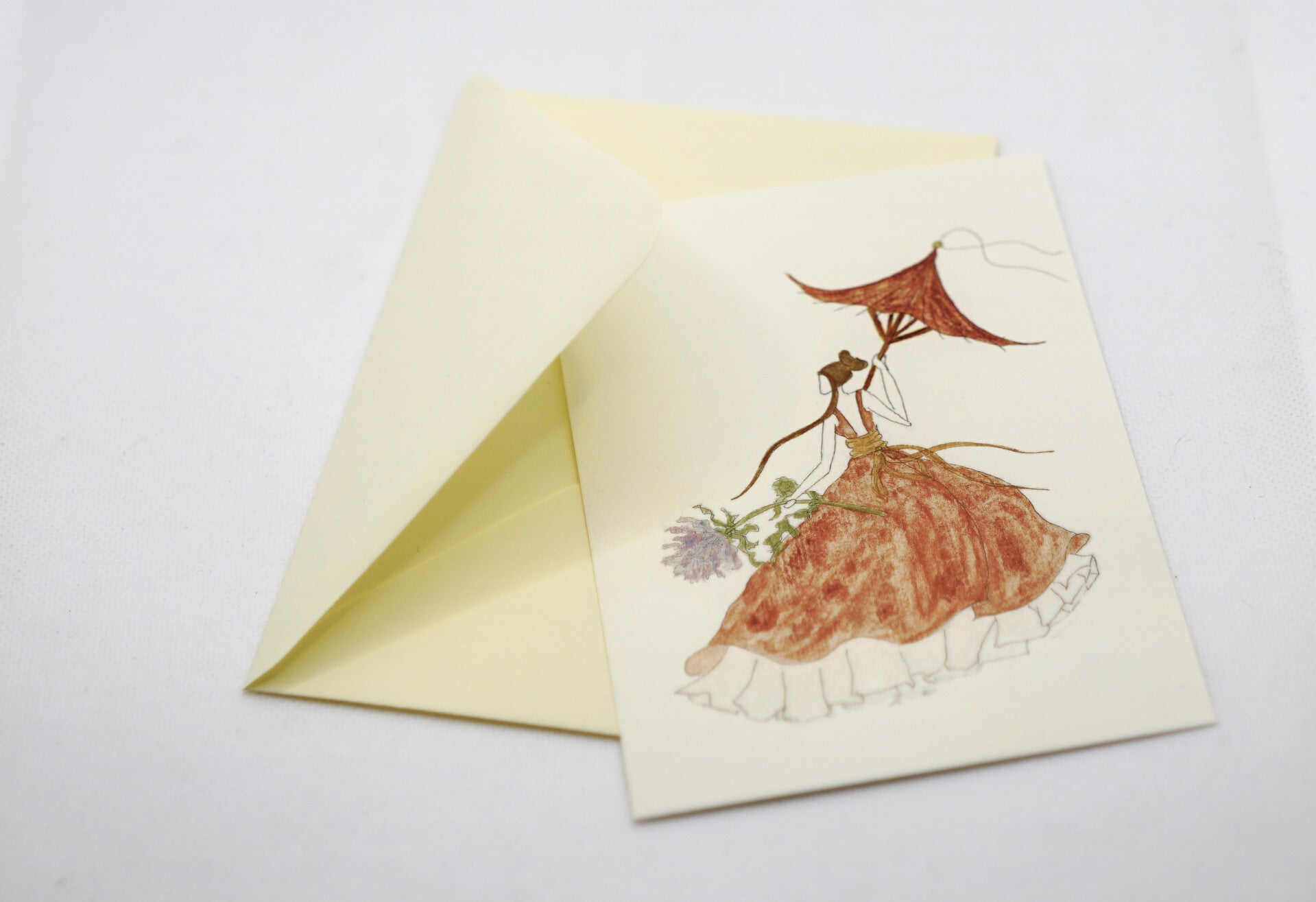 Stilvolle Illustration: Eine Dame im eleganten roten Kleid mit Sonnenschirm und rosa Blume.