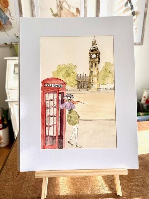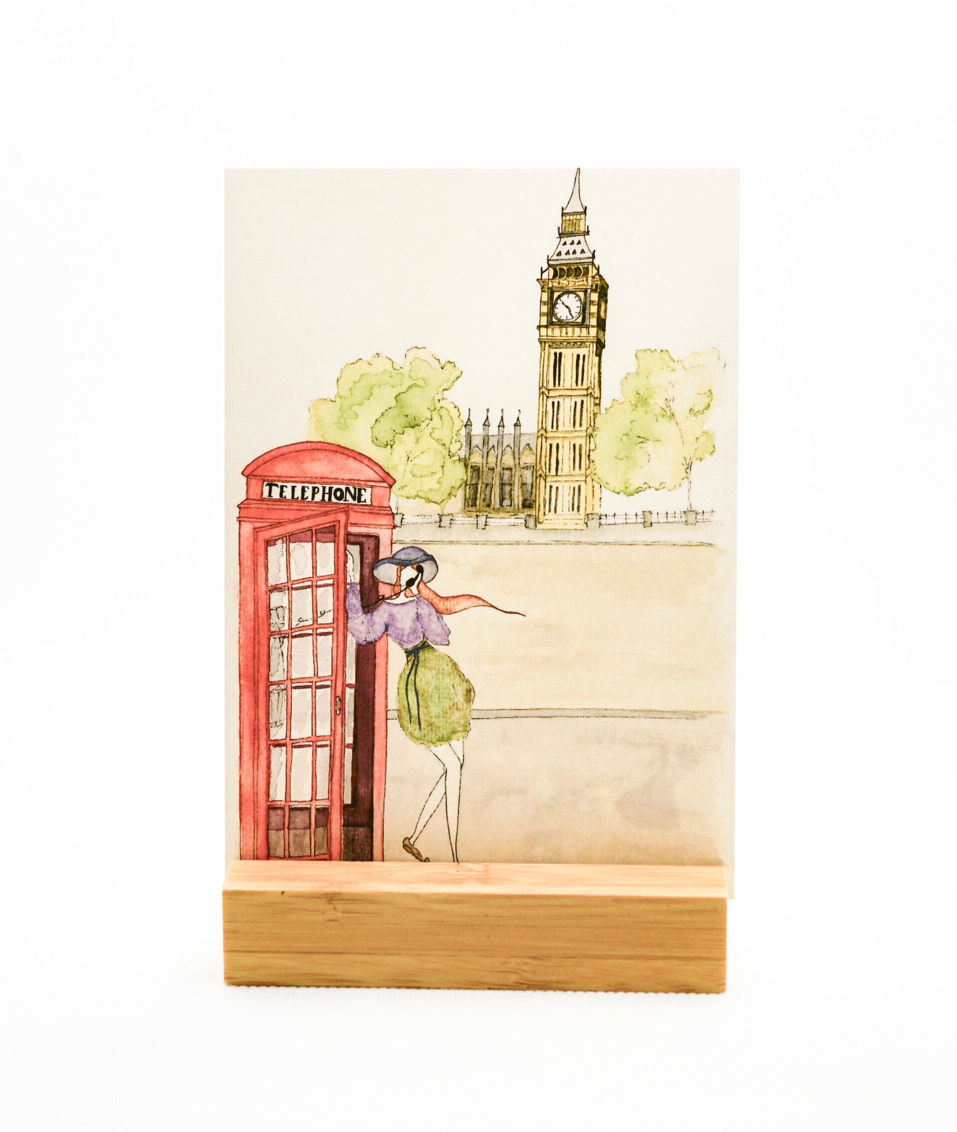 Motiv: Eine elegante Dame in einer Telefonzelle vor der ikonischen Kulisse des Big Ben. Ein klassisches und stilvolles Bild, das London-Flair versprüht.
