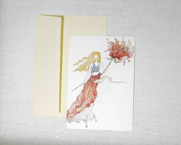 Das kunstvolle Motiv zeigt eine elegante Dame, die eine orangefarbene Blume in den Händen hält – ein stilvoller Hingucker mit besonderem Charme.