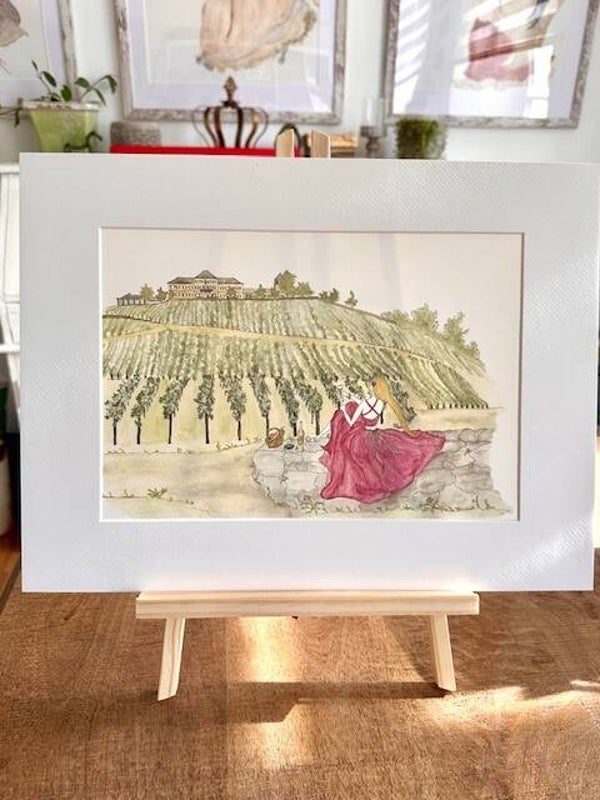 Eine Dame im pinkfarbenen Kleid sitzt entspannt auf einer Mauer, vor ihr erstrecken sich malerische Weinberge, während sie mit einem Glas auf Schloss Johannisberg anstößt.